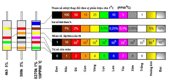 Điện trở thường được ký hiệu bằng 4 vòng màu, điện trở chính xác ký hiệu bằng 5 vòng màu.